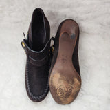 Tory Burch high heeled bootie. Dark chocolate brown suede with tonal moccasin-style stitching and gold hardware. Stacked heel.